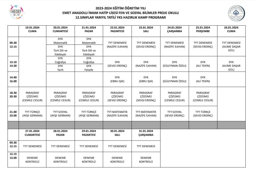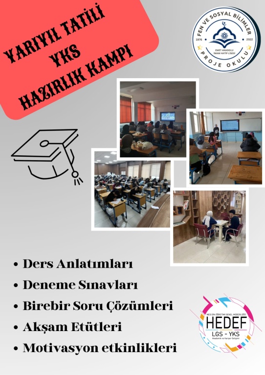 12. Sınıf öğrencilerimize yönelik YARIYIL TATİLİ YKS HAZIRLIK KAMPIMIZ 19 Ocak'ta başlıyor. 24 saat yatılı olarak planlanan kampımızda deneme sınavlarıisoru çözümleri,konu tekrarı,akşam etüt ve motivasyon etkinlikleri gerçekleştirecek. Sınava girecek öğrencilerimize başarılar diler emek sarf eden idareci ve öğretmenlerimize teşekkür ederiz.